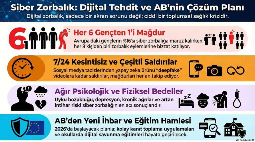 Avrupa Birliği (AB)’nin, siber zorbalığı “dijital güvenlik ekosistemi” içinde ele alan yeni bir eylem planını duyurması bu kapsamda üzerinde durulmaya değer bir gelişme olarak görülmelidir. Bu plan, dijital alanda onur, mahremiyet ve güvenlik kavramlarını “temel hak” düzlemine yeniden yerleştirmeyi hedefliyor.